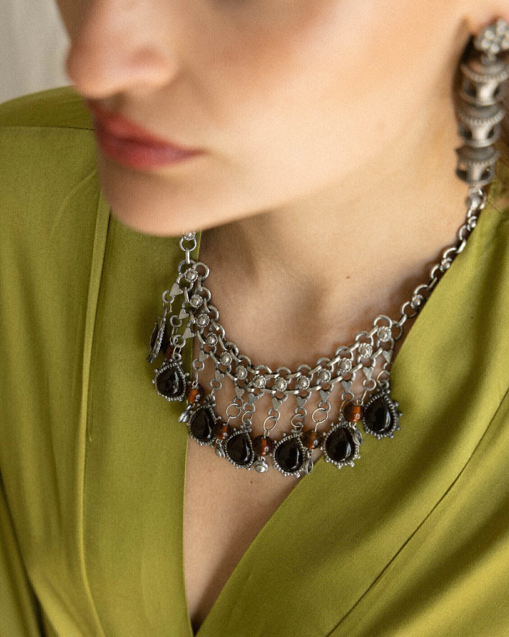 Collar de plata india 900 envejecida, con corazones y gemas de ámbar engarzadas.